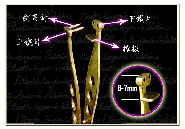 上圖:眼皮釘書的解剖圖。擋板到針孔的距離大約是6-7mm,無法改變,影響了眼褶決定的高度。