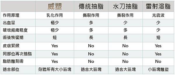 第二格『組織破壞程度』,威塑在溶脂階段或許很『溫和』,但做後要用負壓吸出,