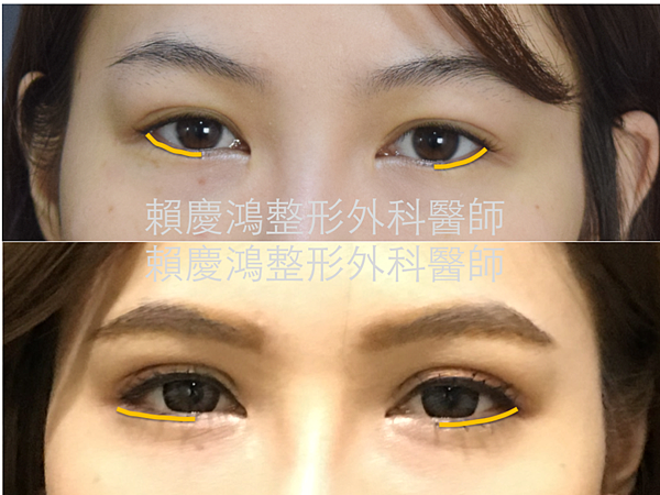 🔼🔼🔼這是一個「眼尾下置」,合併割雙眼皮手術的最後結果,橙色線指出眼尾從「上斜線」變成「水平線」的變化,最後,眼睛呈現的改變,及深邃的程度變化很大!