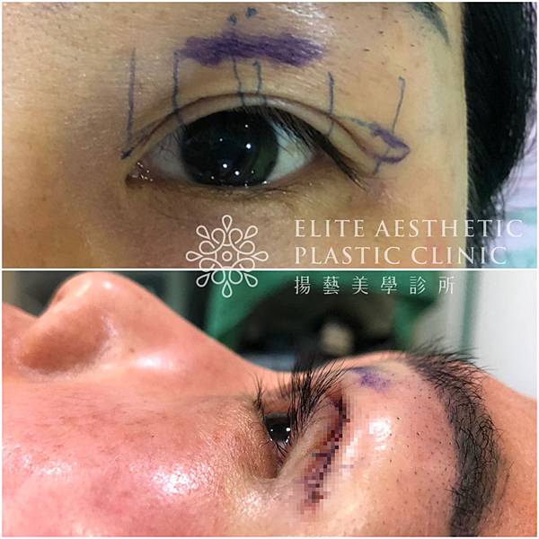 上面這張照片,在上圖是一個重修手術前的患者,之前割過雙眼皮,眼科醫生操刀,修過兩次,但差別不大,所以客人放棄的一段時間。後來因為多重的問題出現,包括上眼凹、雙眼皮摺痕不穩定、睫毛下垂甚至插到眼球、眼尾下垂等等問題出現,到診所想尋求解決。